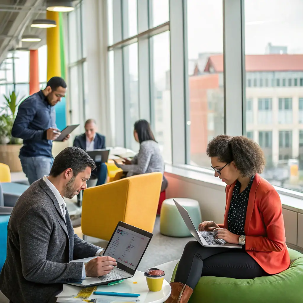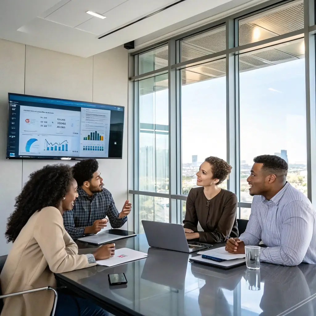 An image of a business team collaborating over digital devices with futuristic digital overlays, representing Cybexis's digital transformation strategies.